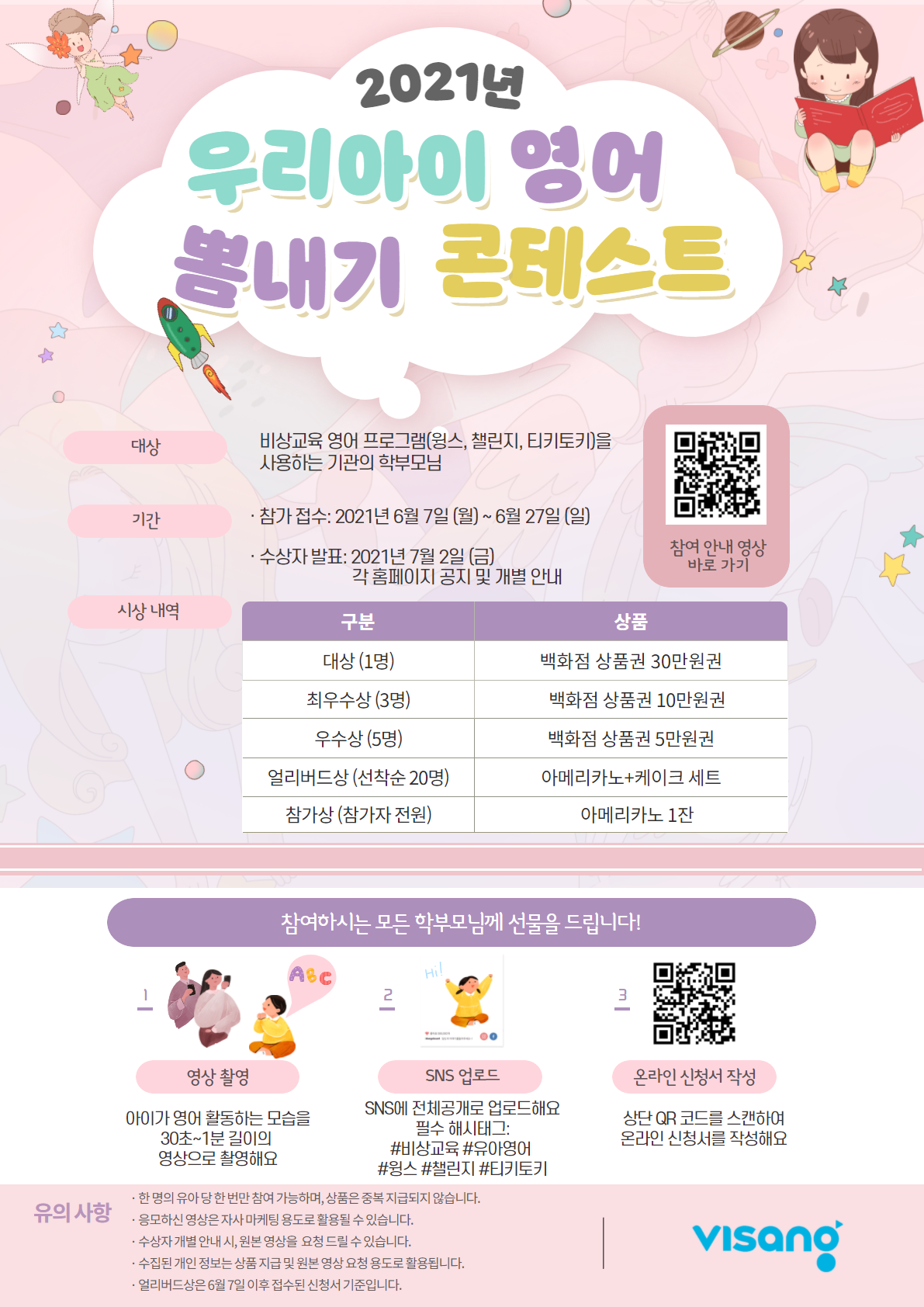 안녕하세요. 티키토키를 사용하는 기관의 학부모님들을 대상으로 2021년 우리 아이 영어 뽐내기 콘테스트를 실시합니다. 가정에서 아이들과 즐겁게 영어 시간을 보내는 모습을 멋지게 뽐내 주세요. 참여하신 모든 학부모님께 선물을 드립니다! 1. 대상: 티키토키를 사용하는 기관의 학부모님 2. 기간: 2021년 6월 7일~6월 27일 (결과 발표: 7월 2일) 3. 참여 방법: 아이들이 티키토키로 즐겁게 영어 학습하는 모습을 촬영하여 SNS에 게시하고 온라인 신청서를 작성해 주세요. 자세한 내용은 첨부된 안내문 또는 기관에서 가정에 전달하신 가정통신문을 참고하여 주세요. 학부모님들의 많은 참여 바랍니다. 감사합니다. |
